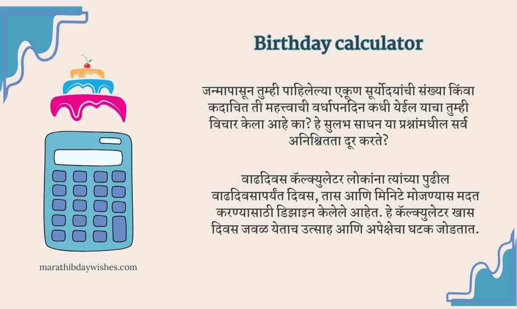 वाढदिवस कॅल्क्युलेटर लोकांना त्यांच्या पुढील वाढदिवसापर्यंत दिवस, तास आणि मिनिटे मोजण्यास मदत करण्यासाठी डिझाइन केलेले आहेत. हे कॅल्क्युलेटर खास दिवस जवळ येताच उत्साह आणि अपेक्षेचा घटक जोडतात.